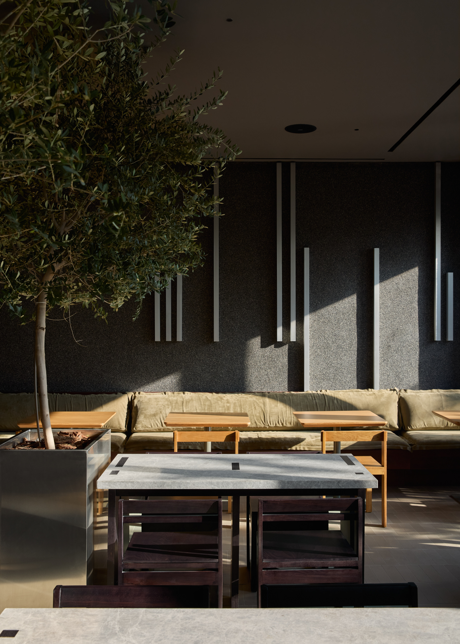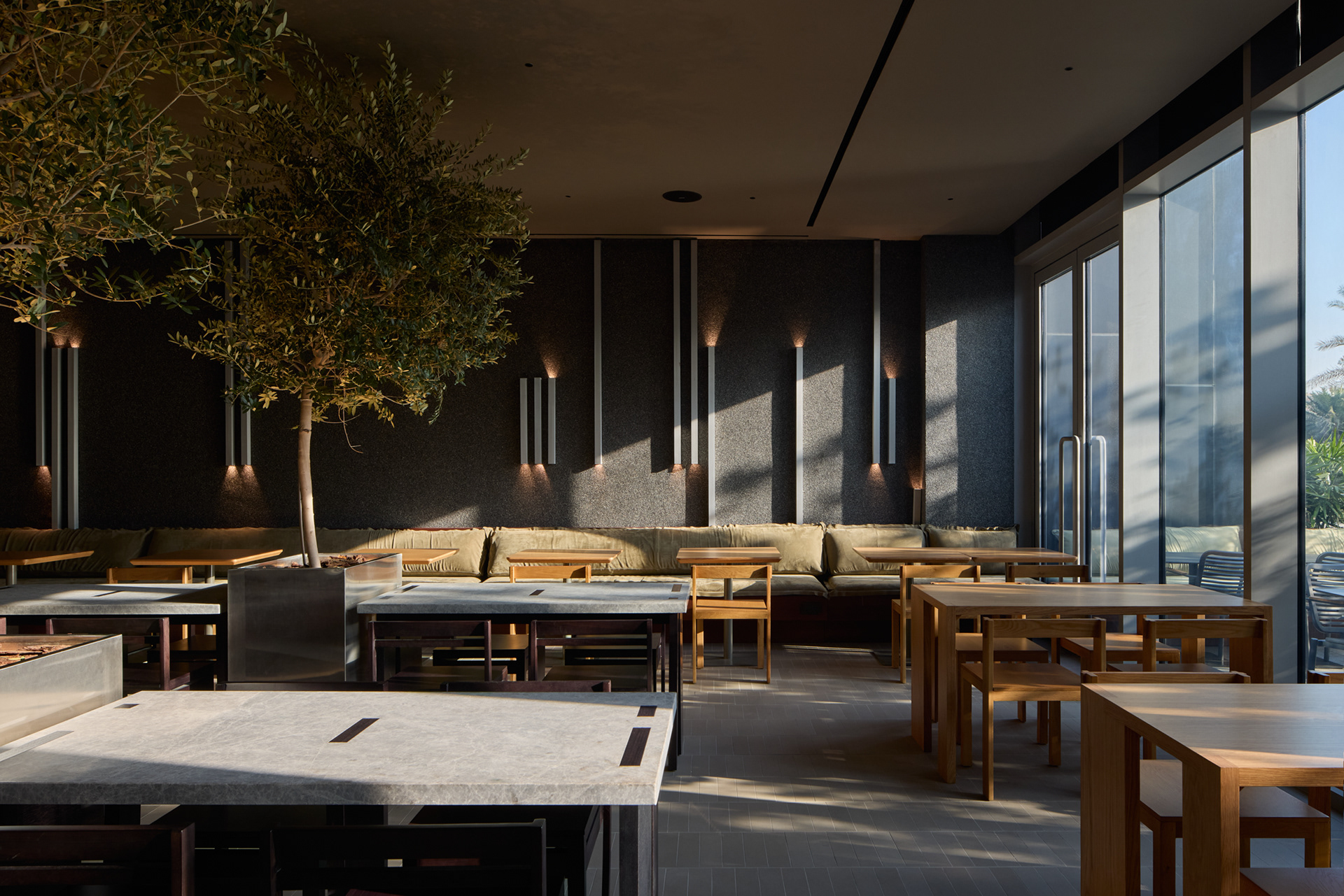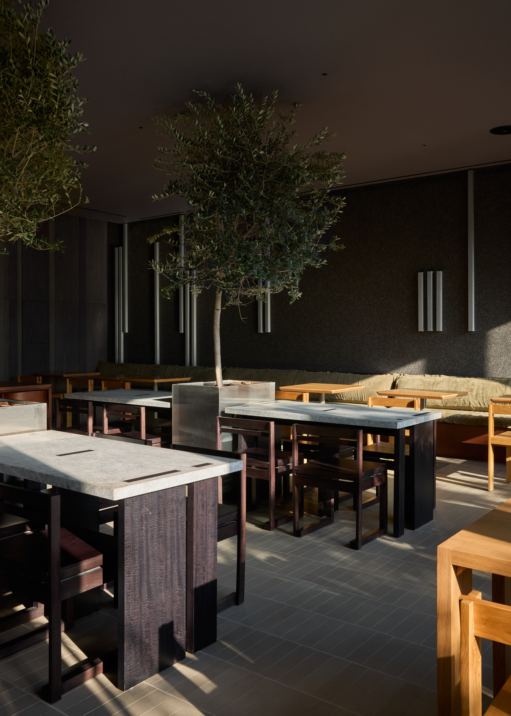 We also brought nature into the space by placing custom metal planters with full-scale trees between the tables. This approach additionally helped to define and separate seating areas in the central part of the dining space within a compact layout.
