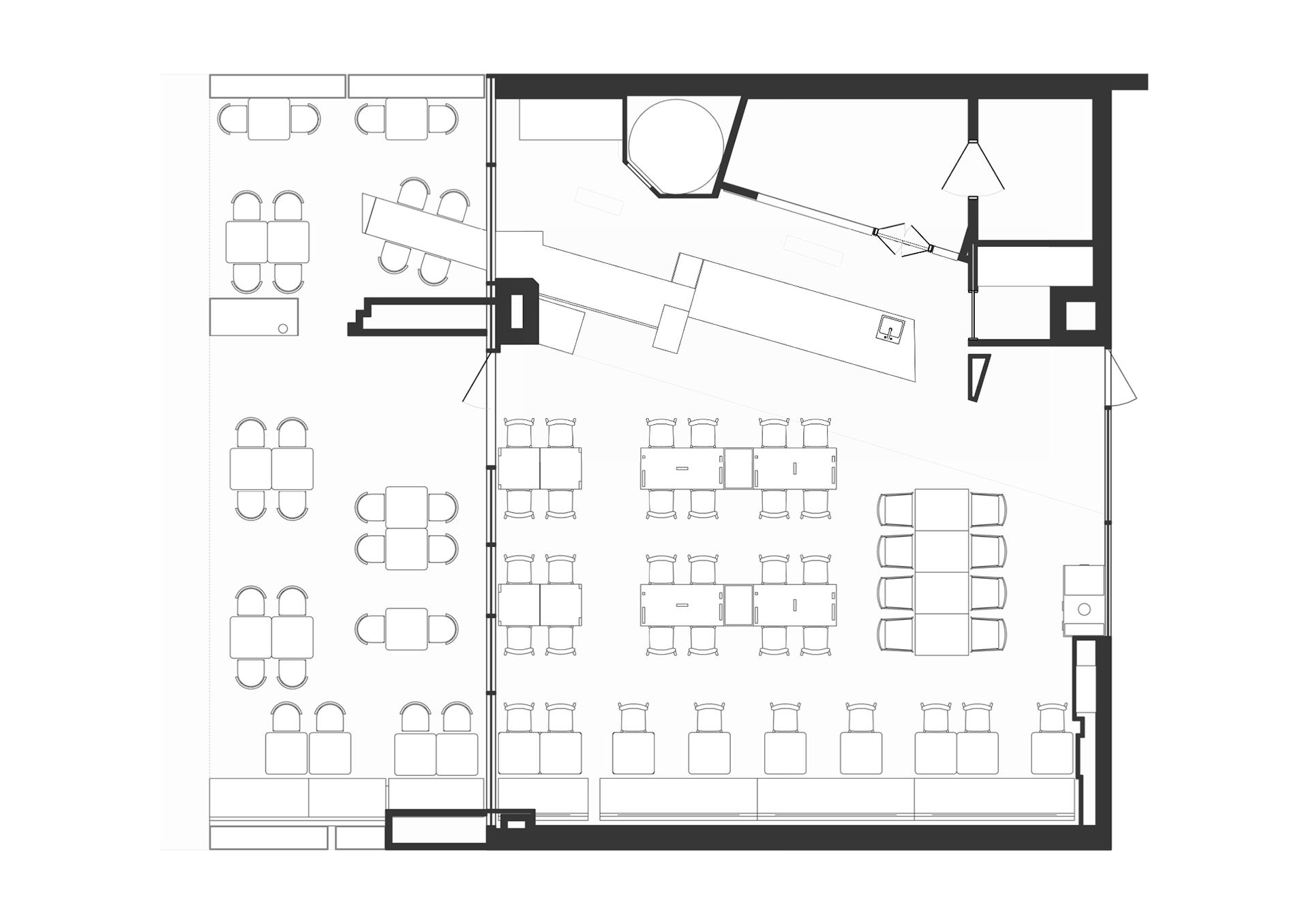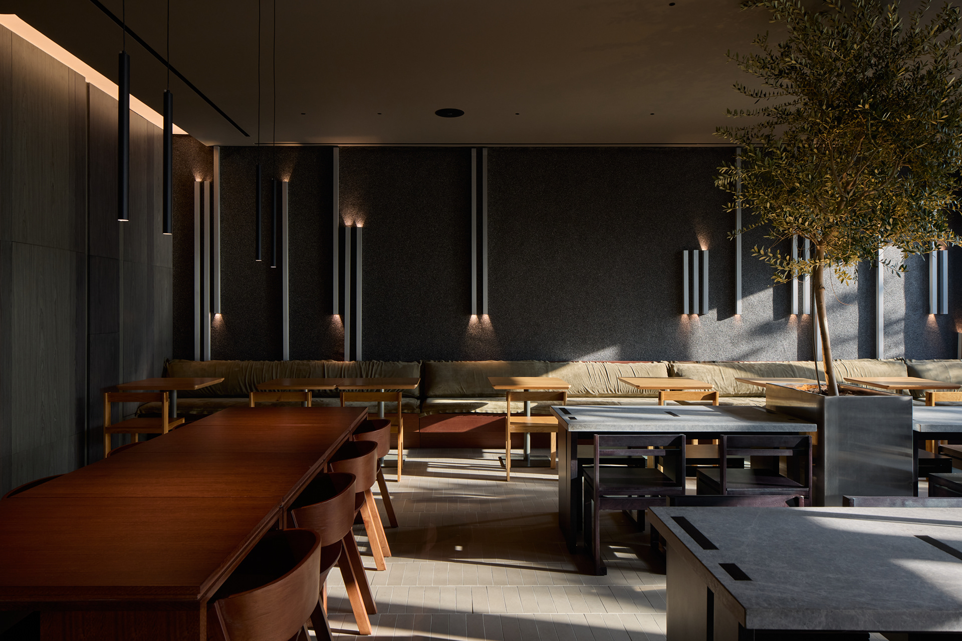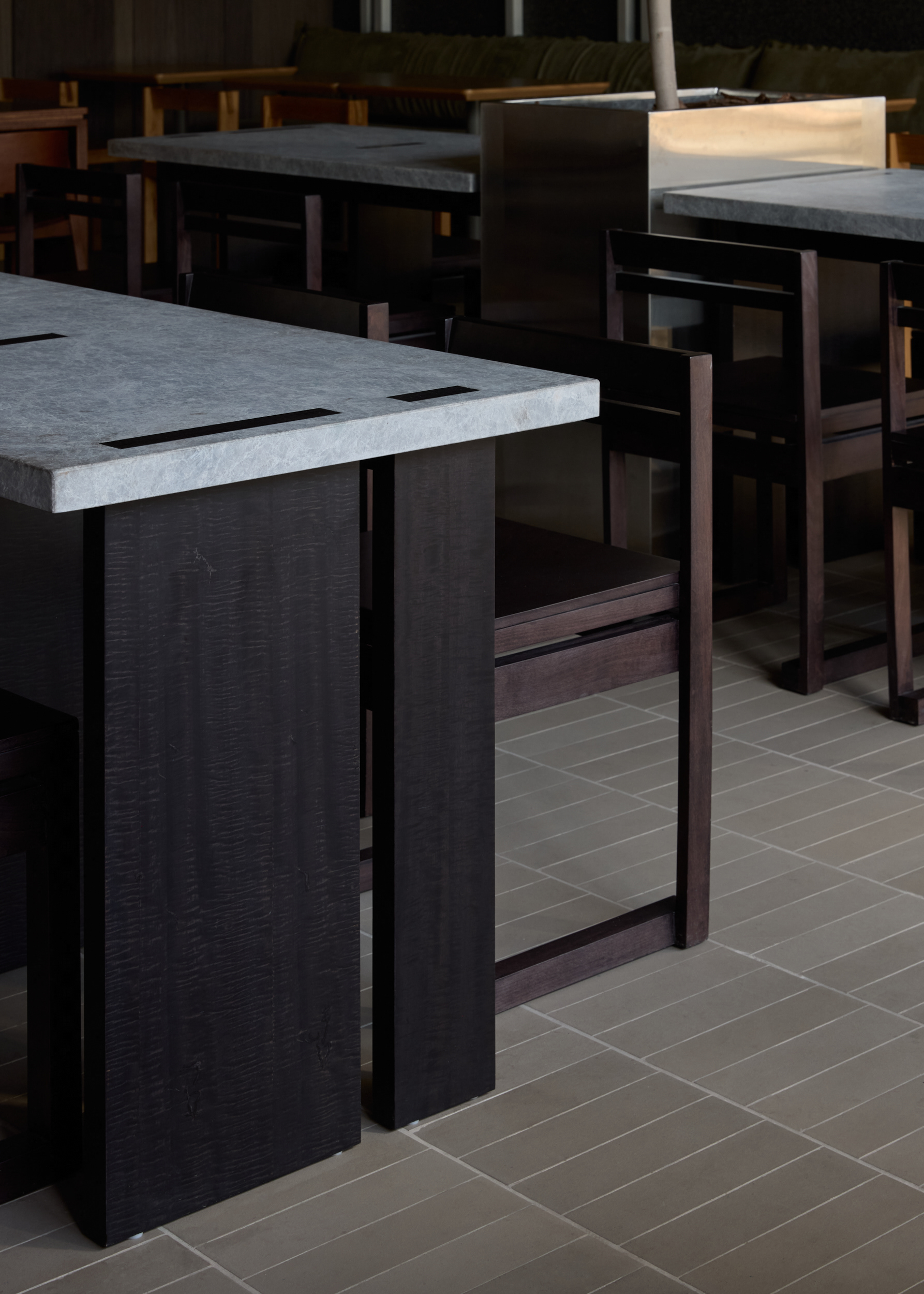 We also brought nature into the space by placing custom metal planters with full-scale trees between the tables. This approach additionally helped to define and separate seating areas in the central part of the dining space within a compact layout.