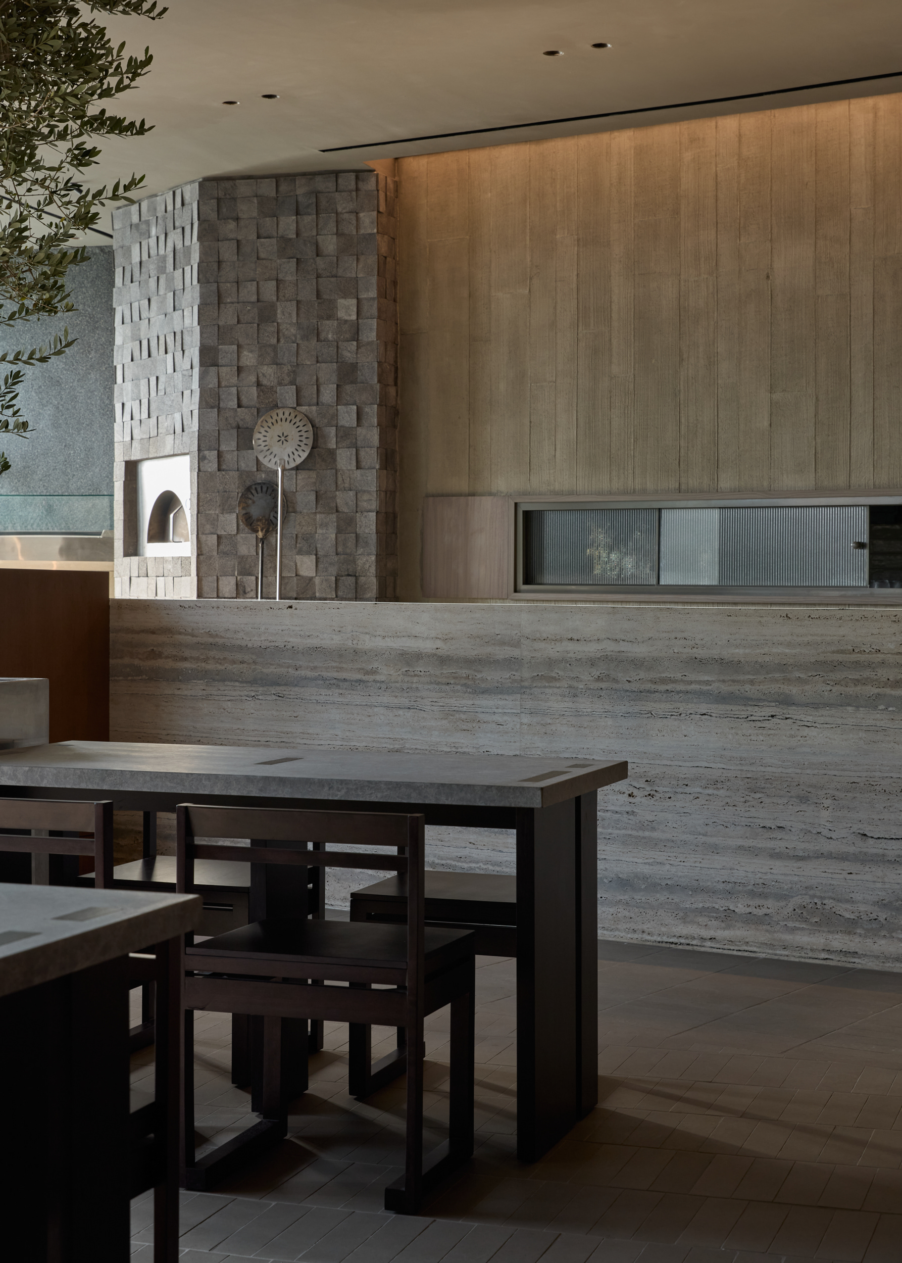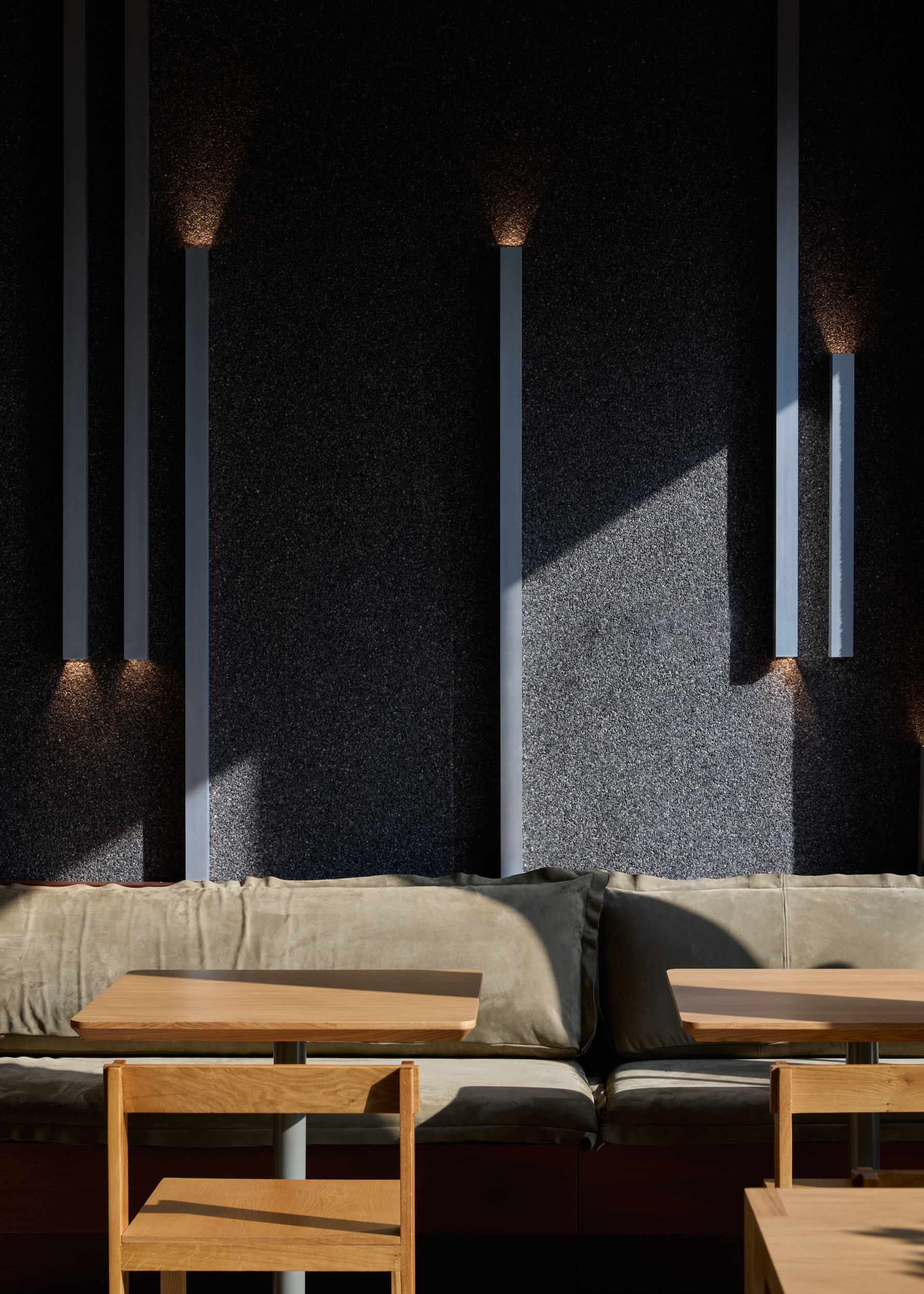 To support a friendly, home-like atmosphere — as if visiting a friend rather than a commercial venue — the interior avoids excessive decoration and complex bespoke details. Instead, almost all furniture was handcrafted by local artisans. The design team developed a deliberately utilitarian furniture language, taking into account local fabrication methods from the outset. The result is simple yet expressive furniture that meets ergonomic requirements while maintaining visual clarity.