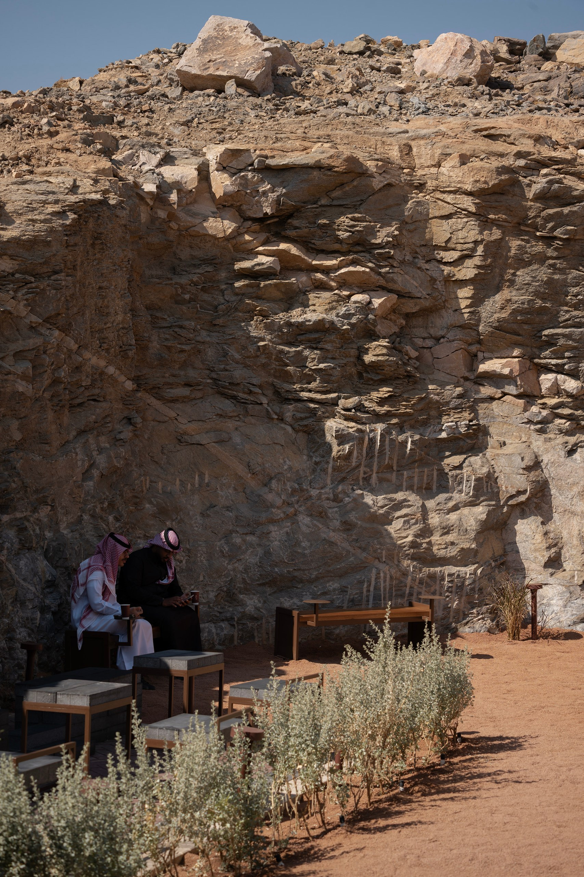 The completed café offers a calm, intimate environment that celebrates material honesty, local craftsmanship, and the unique geological character of the site. By integrating the rock into both the spatial layout and the interior narrative, the project establishes a memorable identity while contributing a contemporary interpretation of Arabian hospitality rooted in place, simplicity, and human scale.